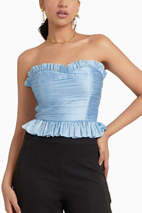 Featuring Blanca Azure Blue Top by Malie. A bandeau style top with an elasticated back for stable comfort. Its heart-shaped neckline and waistline ruffle detail add a chic, feminine touch.