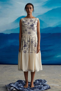 The dress with knife pleats and overlapping shoulders epitomizes a sophisticated and understated style. With an A-line silhouette that gracefully flares from the waist, it crafts a feminine and refined appearance. Effortlessly embodying timeless style, this piece strikes a perfect equilibrium between classic design with a hint of contemporary chic, blending everyday allure with an touch of grace and sophistication.