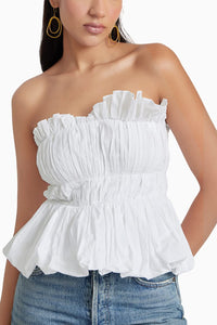 Featuring Bleecker Snow White Top by Malie. This top has a flattering gathered bust and back, with a puffed peplum look at the bottom. It includes a statement frill on the upper bust that enhances its distinctive appearance.