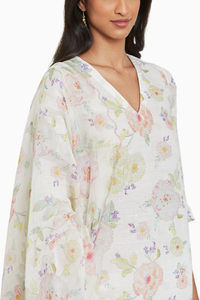 This handwoven sooti chanderi dupatta comes in a soothing sage green hue, adorned with a mesmerizing hand drawn floral print. The delicate embroidered scallop cutwork edges add an exquisite detail.