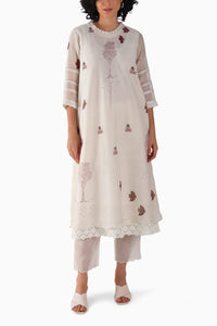 crafted with meticulous attention to detail. Paired with cotton chanderi and stripe organza pants, offering a perfect balance of comfort and style. This ensemble is a timeless combination of classic elegance and contemporary flair, offering a fresh take on traditional prints and silhouettes.