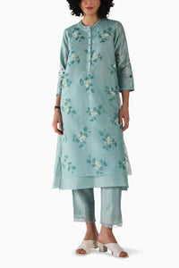 Featuring the mint Tunic in sakura print tonal double layered in organza and silk chanderi, paired with the matching pants is a captivating fusion of elegance and grace. This ensemble epitomizes timeless elegance and understated luxury, making it a versatile choice for a variety of occasions.