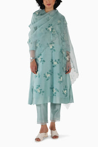 Featuring the mint Tunic in sakura print tonal double layered in organza and silk chanderi paired with the pants with dupatta ensemble is a captivating fusion of elegance and grace. This ensemble epitomizes timeless elegance and understated luxury, making it a versatile choice for a variety of occasions.