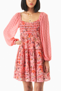 The Bloom dress, cra fted in Miri’s roma ntic pink print is ma de in our summer blend viscose georgette. The dress ha s smocking on the front a nd ba ck to give it a fitted look. Its voluminous skirt is deta iled with la ces. The sleeves in a complementing print, a re ela stica ted a t the cuffs.