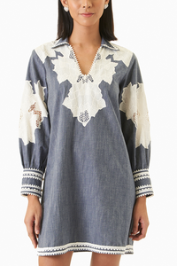 Featuring the Blossom Dress, a charming cotton denim creation that showcases beautiful appliqué embroidery. This delightful dress combines comfort with elegant detailing, perfect for any occasion.