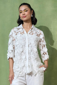This elegant collared shirt crafted from delicate floral lace. The intricate 3D lace detailing adds a touch of romantic charm and texture, making this shirt a perfect blend of classic tailoring and contemporary design.