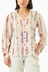 Feminine and suave, the Blossom Overlay Shirt is a formal garment with a whimsical twist. It features intricate and unique floral embroidery, along with delicate puffed sleeves.