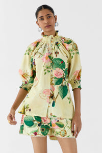 The Blossom Ruching shirt & shorts Co-ord crafted from our stunning 100% cotton slub fabrication, trans-seasonal, is a statement piece. This shirt, in our renaissance florals and english jewels, has a ruched neckline and cuff. With lace detailing, the shirt has a boxy fit and front buttons. Featuring a summery look, it is paired with our matching shorts. They are lined and have pockets.