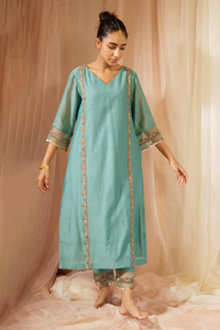 Featuring Blue Abir Kurta Set by Sarang Kaur from Gulaal Collection. This mesmerizing ensemble of a blue embroidered kurta paired with matching pants in chanderi base. Elevating its allure with its shimmering texture and exquisite detailing.