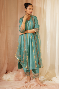 Featuring Blue Abir Stole by Sarang Kaur from Gulaal Collection. Adding a touch of glamour in this embroidered blue organza dupatta, which drapes gracefully over the ensemble, elevating its allure with its shimmering texture and exquisite detailing.