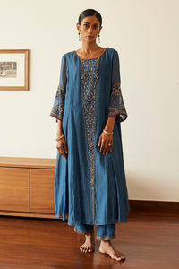 Featuring Blue Adree Kurta Set by Sarang Kaur by Akaari Collection. This charming ensemble in tranquil blue features Chanderi silk for both the kurta and pants. Ideal for those who seek elegance and comfort, blending traditional craftsmanship with contemporary flair effortlessly.