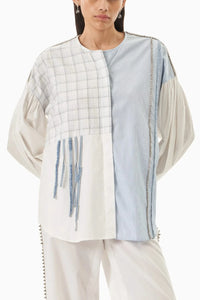 This blue cotton two-panel balloon sleeve shirt blends classic craftsmanship with modern details. The voluminous balloon sleeves add a dramatic touch, while the sleek stud line embellishment brings an edgy, refined accent. Perfect for those seeking a statement piece that balances boldness with sophistication.