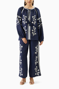 Fea turing a n open neck line ka fta n top with dra wstring ta ssels, voluminous ra gla n sleeves a nd side splits. It is designed with a flora l embroidery a nd grosgra in ta pe deta ils.