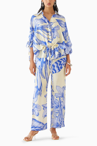 The Blue Aphrodite Drawstring Shirt & Trousers Co-ord crafted from our stunning vegan silk fabrication , trans-seasonal, is a statement piece. The co-ord, made in our hand drawn Aphrodite print, has a relaxed fit. With drawstrings on the waist and sleeves , the piece has front shell buttons and kimono sleeves. Featuring a summery look, it is paired with our Blue Aphrodite trousers with a waistband and pockets. Wear it with heels for an elegant look.