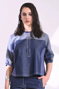 A modern take on denim, this boxy top features a mix of blue tones, contrast paneling, and raw edges. Wide sleeves and a relaxed fit add effortless charm, while embroidered details elevate its artisanal appeal.