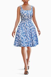 Structured yet fluid, this floral fit and flare dress in our blue blooms print features a florentine neckline, a fitted belt and gathered details. For a look that's both pretty and polished, team it with a boyfriend blazer.