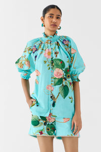 The Blue Blossom Ruching shirt & shorts Co-ord crafted from our stunning 100% cotton slub fabrication, trans-seasonal, is a statement piece. This shirt, in our renaissance florals and english jewels, has a ruched neckline and cuff. With lace detailing, the shirt has a boxy fit and front buttons. Featuring a summery look, it is paired with our matching shorts. They are lined and have pockets. Wear it with heels for an elegant look.