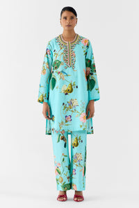 The Blue Blossom Stonework Kurta & Pants crafted from our stunning 100% cotton slub fabrication, trans-seasonal, is a statement piece. This kurta, in our renaissance florals and english jewels, has a hand embroidered swarovski neckline. With lace detailing, the kurta is lined and has pockets. Featuring a festive look, it is paired with our matching straight pants with back elastic.Wear it with heels for an elegant look.
