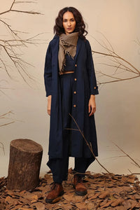 Full length jacket with peter pan collars and full sleeves with side pockets. Full button closer in the front. Layer it on any cord set from this collection or team it up with pieces in your wardrobe. A perfect travel jacket.