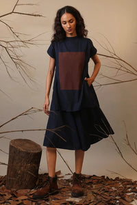 Applique style colour block dress in layers giving skirt and top like feel in one piece. Ribbed colour details on the neckline and side pockets.