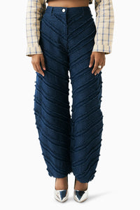 Featuring the Blue Cine Pants by OSHIN's SS'25 collection. These high-waisted pants showcase a circular pant leg, frayed fabric strip detail, front fly closure, and functional front side pockets—offering a bold silhouette with artisanal flair.