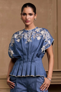 This blue cotton twill waist pleated top is a stylish fusion of contemporary design and intricate detailing. Featuring contrast appliqué, cutwork, and beadwork, the top adds texture and sophistication to the rich blue fabric. The pleated waist creates a flattering, structured silhouette, while the delicate embellishments enhance the overall design with a modern, artistic touch.