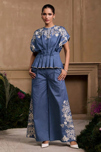 This striking ensemble combines the blue cotton twill contrast appliqué, cutwork, and beadwork waist pleated top with matching flared pants, creating a chic and sophisticated look. The pleated top features intricate detailing with appliqué, cutwork, and beadwork, adding texture and depth to the rich blue fabric, while the waist pleating enhances the flattering silhouette. Paired with the coordinating flared pants, which also feature the same detailed embellishments, the set offers a balanced blend of structure and flow.