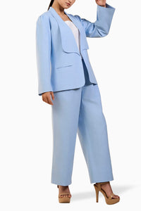 This co-ord set includes a solid jacket, ankle-length pants, and a shoulder-strapped camisole. The jacket features a broad lapel and a shawl collar, with a front opening and slit pockets on both sides. Its puff sleeves add a stylish touch. The pants are ankle-length with a high-rise waist, featuring pleats on both sides, a fly and zipper at the front, and loops for a belt. They also have pockets on both sides. The camisole has wide shoulder straps and a square neckline, adorned with wooden buttons at the side seams. It closes at the side seam and features slits for added comfort and style. Together, these pieces create a chic and coordinated outfit.