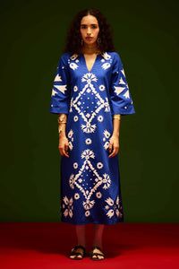 Featuring a blue cotton poplin maxi dress with exquisite ivory sitara thread embroidery, this relaxed-fit piece combines vibrant color with detailing for a comfortable and stylish statement.