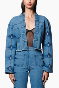 Featuring Blue Denim Embellished Crop Jacket by Mellow Drama from their A/W'24 Collection - Catalyst. Elevate your denim style with this lightweight lycra denim crop jacket. It boasts full sleeves with wash effect and embellishment, a front-open design with a placket and loop detail, pockets at the front, and a raw edge at the hem. Make a statement with this chic and embellished piece.