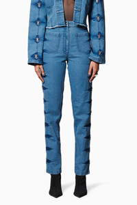Featuring Blue Denim Embellished Pants by Mellow Drama from their A/W'24 Collection - Catalyst. Elevate your denim game with these lightweight lycra denim washed pants. They feature front and back pockets, a front opening with zipper and statement logo button, wash effect at the side seam, and embellishment. The high-waisted, straight-fit design adds a touch of sophistication to your casual look. Redefine your style with this chic and embellished piece.