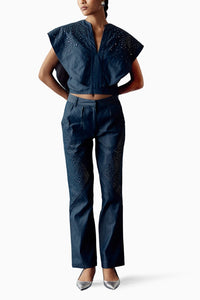 Pair it with our 100% Cotton Denim Pants, boasting mirror embellished yoke on the front & back, front opening with zipper & hook, side pockets, and a high waist, all in a stylish regular fit.