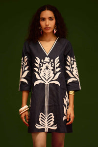 Featuring a blue denim shift dress with delicate ivory tulip thread embroidery, this relaxed-fit piece combines casual comfort with charming floral detail for an effortlessly stylish look.