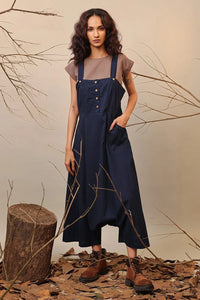 Strap dungarees with adjustable buttons on the straps. Made in handspun cotton comes with side pocket. Team it up with any contrast crop top from the collection to complete the look.