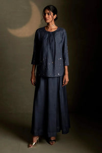 From our Chandni Raatein collection, this deep blue outfit features a divided flared skirt paired with a short kurta-style top. The top is embroidered with tiny star motifs and a crescent moon in glass, keeping the look subtle, festive, and contemporary.