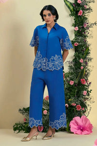 A graceful blend of craftsmanship and style, this blue co-ord set features delicate embroidery and intricate cutwork along the hemline and sleeves of the collared V-neck shirt. Paired with straight-fit pants adorned with embroidered and cutwork detailing at the hem, it offers an effortlessly elegant and timeless appeal.