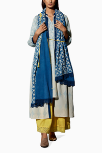 Featuring the Blue Festive Coord Set by Jayati Goenka, a captivating quartet for festive occasions. This four-piece co-ord set showcases a light blue printed maxi overlay with a matching dress inside, paired with an ankle-length lush cotton soft skirt and printed stole. Detailed with JG signature button knot accents and crafted from natural dyed and handblock printed cotton blend fabric, it exudes effortless elegance.
