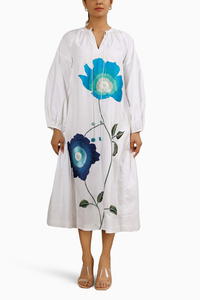 Featuring a white A-Line Dress in cotton base with exquisite floral embroidery with resham and sequins, which is perfect for your summer wardrobe.