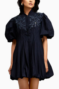 Blue Floral Applique Structured Mini Dress With Puff Sleeves