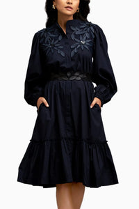 Elevate your style with this sophisticated dress, showcasing intricate floral embroidery that adds a rich, artistic touch to the design. The long, structured sleeves create a refined and elegant silhouette, perfectly complementing the dress's classic yet modern appeal. A flattering belt cinches the waist, accentuating your figure and adding definition to the ensemble. Ideal for formal occasions or evening events, this dress combines timeless elegance with bold, intricate details for a standout look.