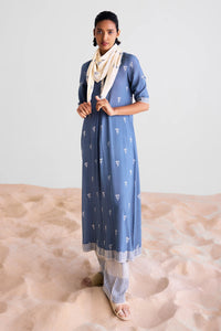 Featuring Blue Grey Kurta Set With Scarf by Cotton and Clay, a stylish three-piece ensemble crafted from soft printed modal fabric. The elegant kurta pairs seamlessly with matching trousers and a coordinating scarf in soothing blue grey and off-white tones, perfect for effortless everyday elegance.