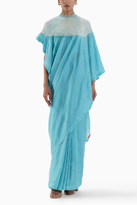 Featuring handwoven saree dyed in blue with our signature shibori detail on the neckline, finished with an itajime facing. It comes with an unstitched blue silk blouse piece.
