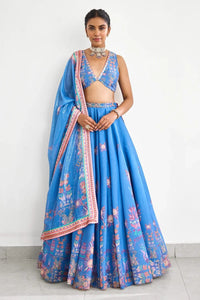 Dreamy and delicate, this blue chanderi lehenga set captures ethereal beauty. The subtle prints and shimmering sequin dupatta create a perfect harmony of grace and festive shimmer.