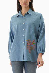 Featuring a denim blue shirt with embroidery, designed in a flattering straight fit. Crafted from cotton fabric, this piece radiates elegance and style.