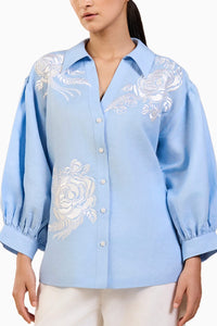 Blue Iceberg Shirt: a pinnacle of smart elegance and cool sophistication. Crafted from super soft linen, its exquisite handwork embroidery adds a touch of timeless charm. Experience unparalleled comfort and style in this must-have addition to your wardrobe.