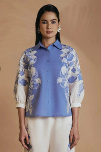 Effortlessly elegant, this blue and white regular-fit shirt features intricate appliqué work and embroidery, adding a touch of artisanal charm. Designed with a front button closure, cuffed sleeves, and a high-low hemline with side slits, it offers a perfect balance of structure and flow for versatile styling.