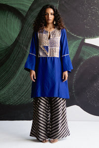 Featuring a cobalt blue kurta with gold embroidery at the front panel and subtle sleeve accents, paired with black and white striped wide leg pants and a matching blue dupatta, this ensemble is crafted in silk tissue organza and designed in an A-Line silhouette with a relaxed fit and a classic round neck, creating an effortlessly elegant look.