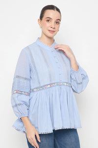 Comfort meets charm in this fit-and-flare top. Delicate lace details with floral embroidery and textured voile on the bodice and sleeves come together to create an effortlessly special look.