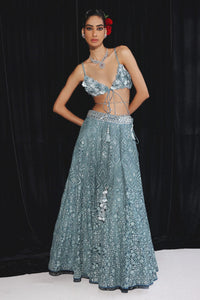 Blue Lace Work Lehanga Set With Mirror Work & 3D Floral Bralette