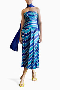 Experience the beauty of Indian Leheriyas silk fabrics with this set. The unique striped patterns are created through a resist dyeing technique, exclusive to the state of Rajasthan in India. The set includes a draped top and pleated midi skirt, making it a staple in any wardrobe.